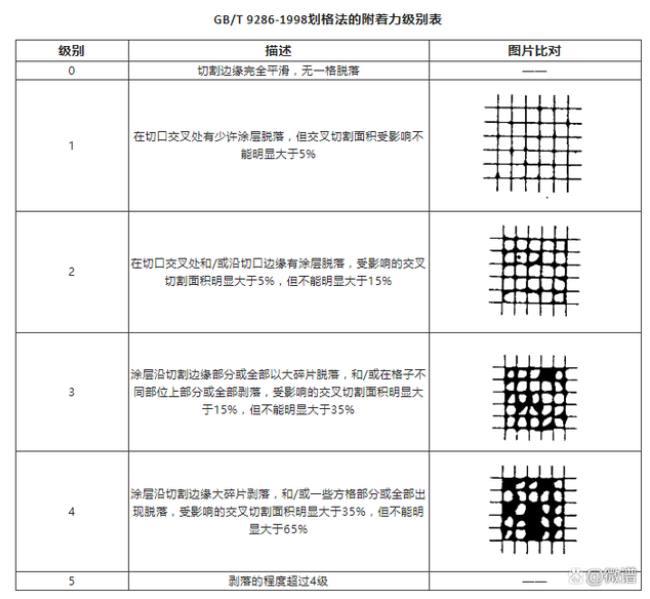 評(píng)級(jí)方法:在良好照明的環(huán)境下,目視檢查測(cè)試面涂層的脫落情況。附著力共分6個(gè)等級(jí),從0級(jí)到5級(jí)涂層附著力依次遞減,5級(jí)最差。GB/T 9286-1998劃格法的附著力級(jí)別見(jiàn)下表。