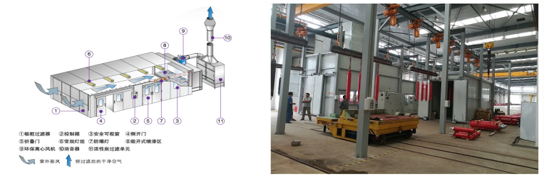 干式噴漆室是在噴漆房格柵下方設置干式過噴涂料分離系統。